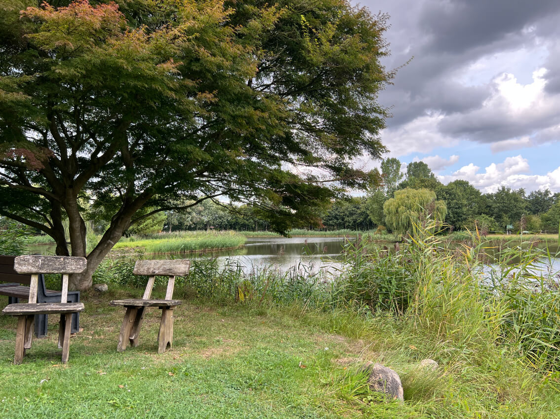 Zwischen den Gebäuden liegt ein Teich mit einer Hütte, an der man sich wie in einem Zen-Garten fühlt – ein echter Ruhepol.